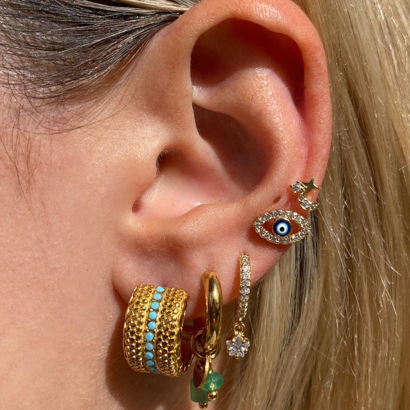 The Arlet Stud features a minimalist design with a stainless steel post, moon and star charms, and a striking crystal encased in gold. Create playful ear stacks with this stud for a unique and eye-catching look.