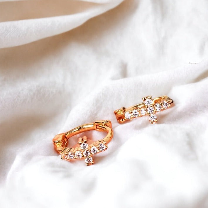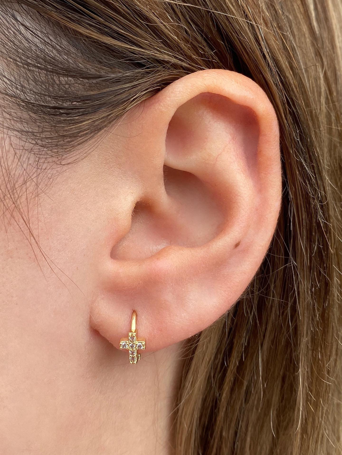 Start your stack off right with The Aurora Huggie! Crafted with sterling silver, encrusted with sparkling crystals, and finished with a gleaming gold cross, these huggies know how to make an entrance! Whether accessorising your look, or just adding to the stack, The Aurora Huggie is the perfect way to show your style!