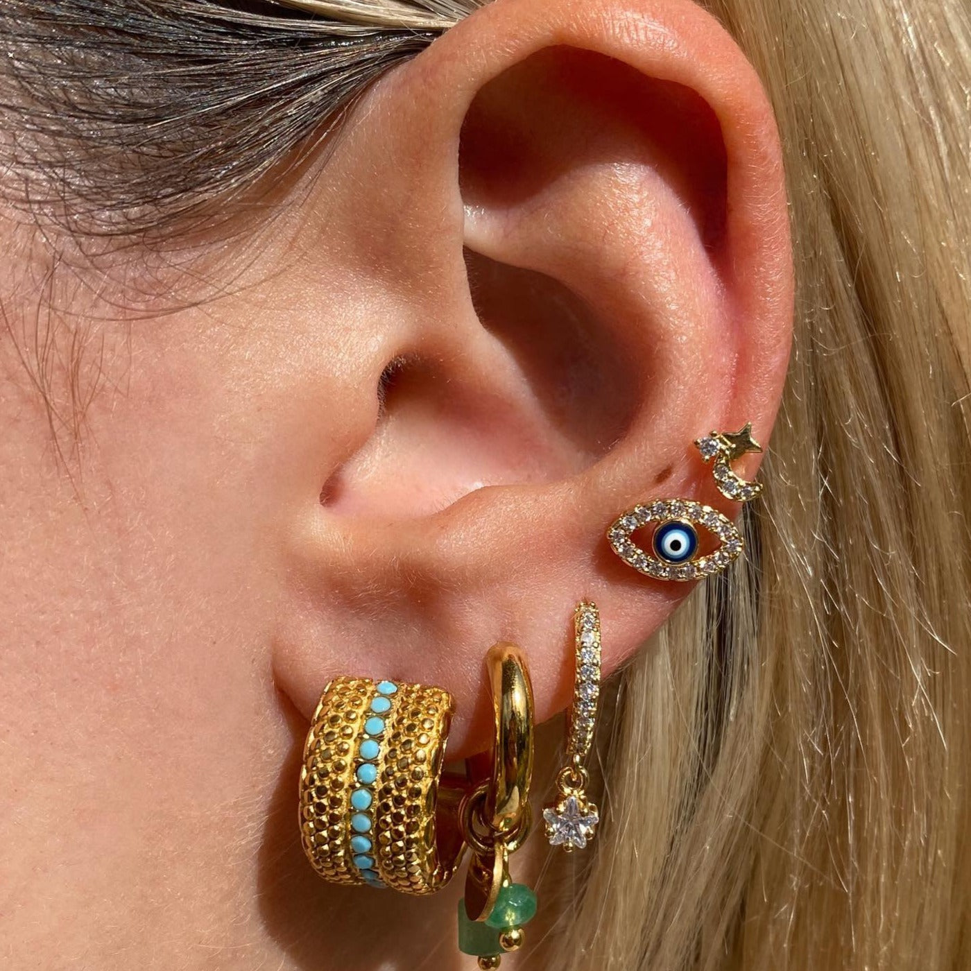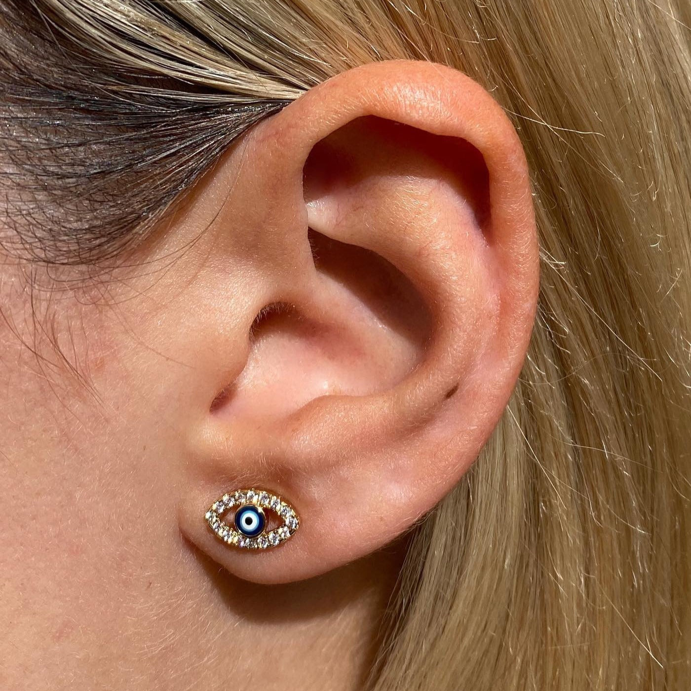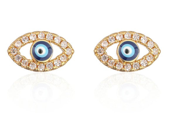 The Carla Stud earrings are crafted from copper and metal and adorned with a striking blue evil eye symbol. With their unique European-inspired design, these crystal-studded beauties offer a fashionable and timeless look.