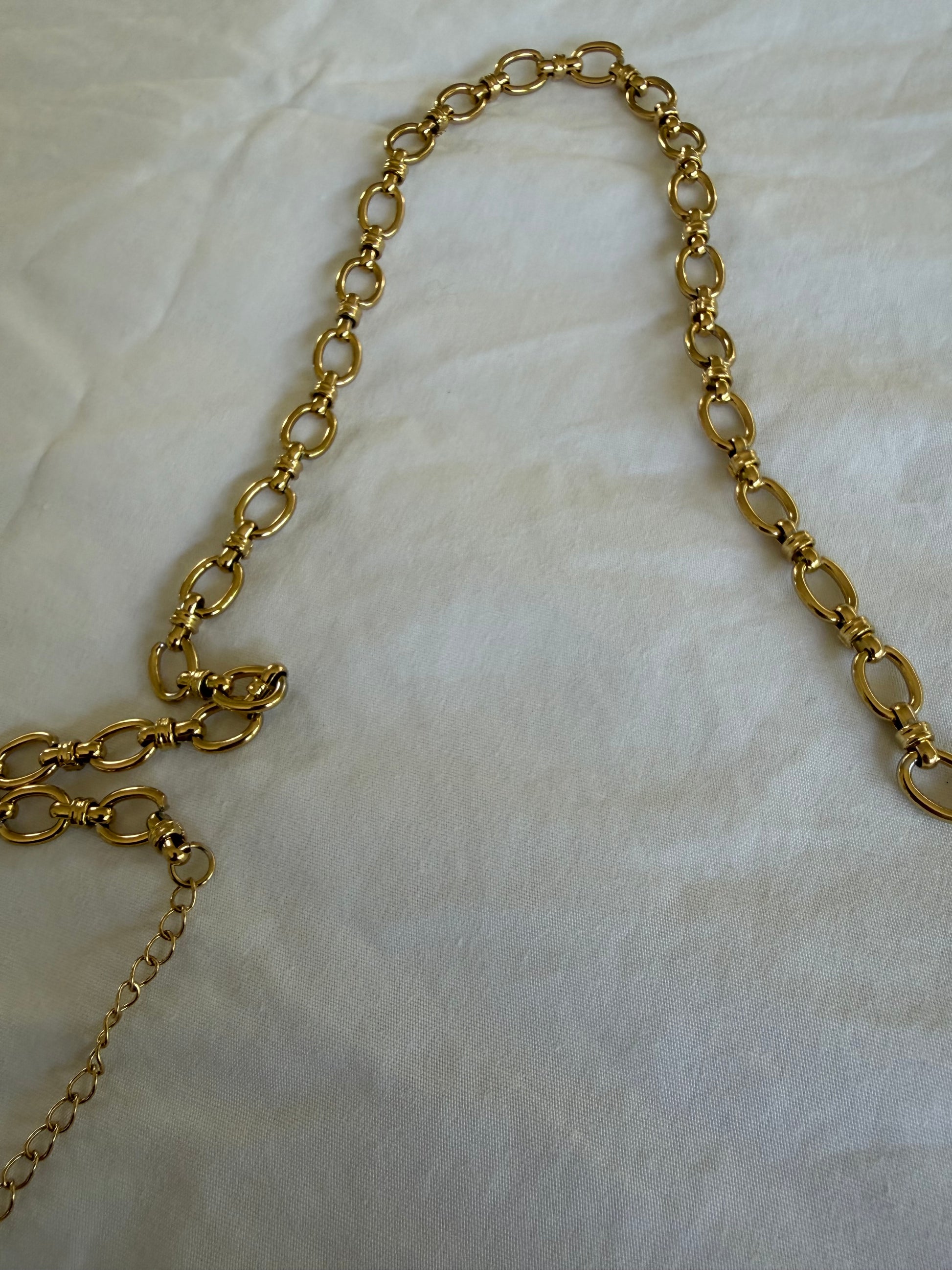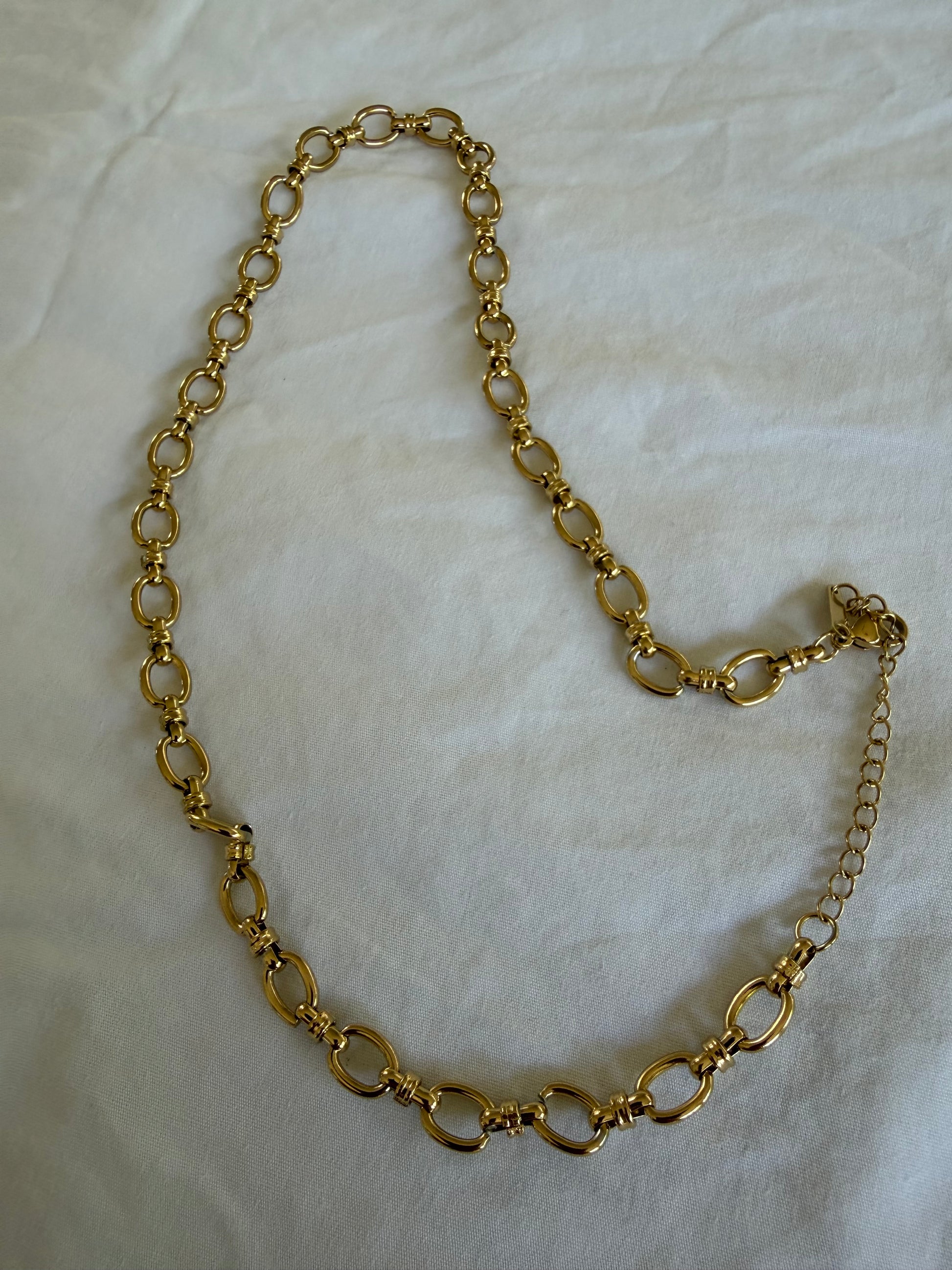Catenia is your go-to chain for effortless impact. Featuring bold oval links with a smooth gold finish, this necklace is designed to sit perfectly at the collarbone and elevate even the simplest outfit.