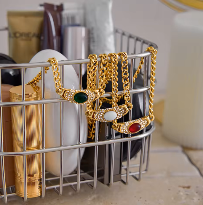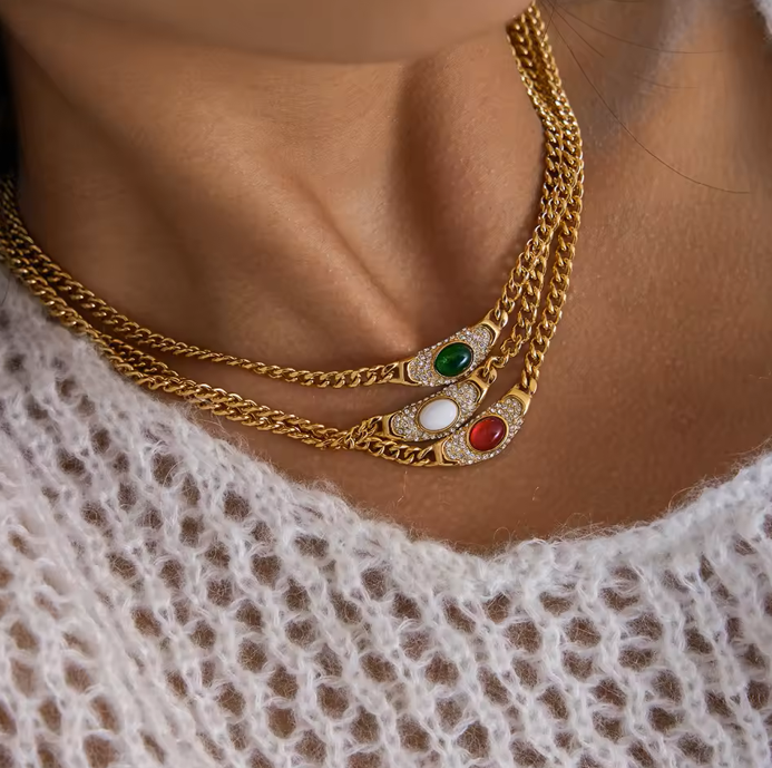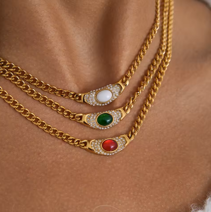 Bold, luxe, and eye-catching- the Valentina Necklace is a statement piece that turns heads. Featuring a rich gold chain with an oval gemstone framed by pavé crystals, it captures vintage glamour with a modern twist. Choose from three striking hues- deep green, pearl white, or fiery red- to match your mood or layer them for extra impact.