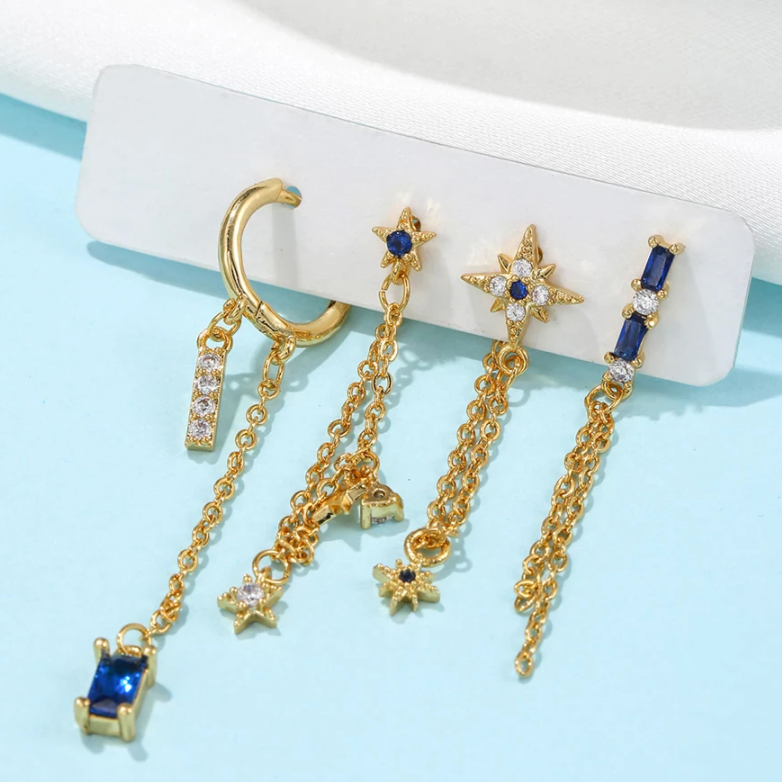 The Fiva Earring - get your bling on with this stackable gold piece! Featuring blue and crystal rhinestones and a dangle chain, this earring adds a sparkle to any look! (The Fiva Earring comes in a set of two, in case one just isn't enough!)