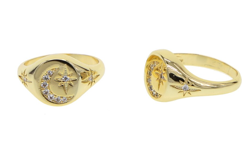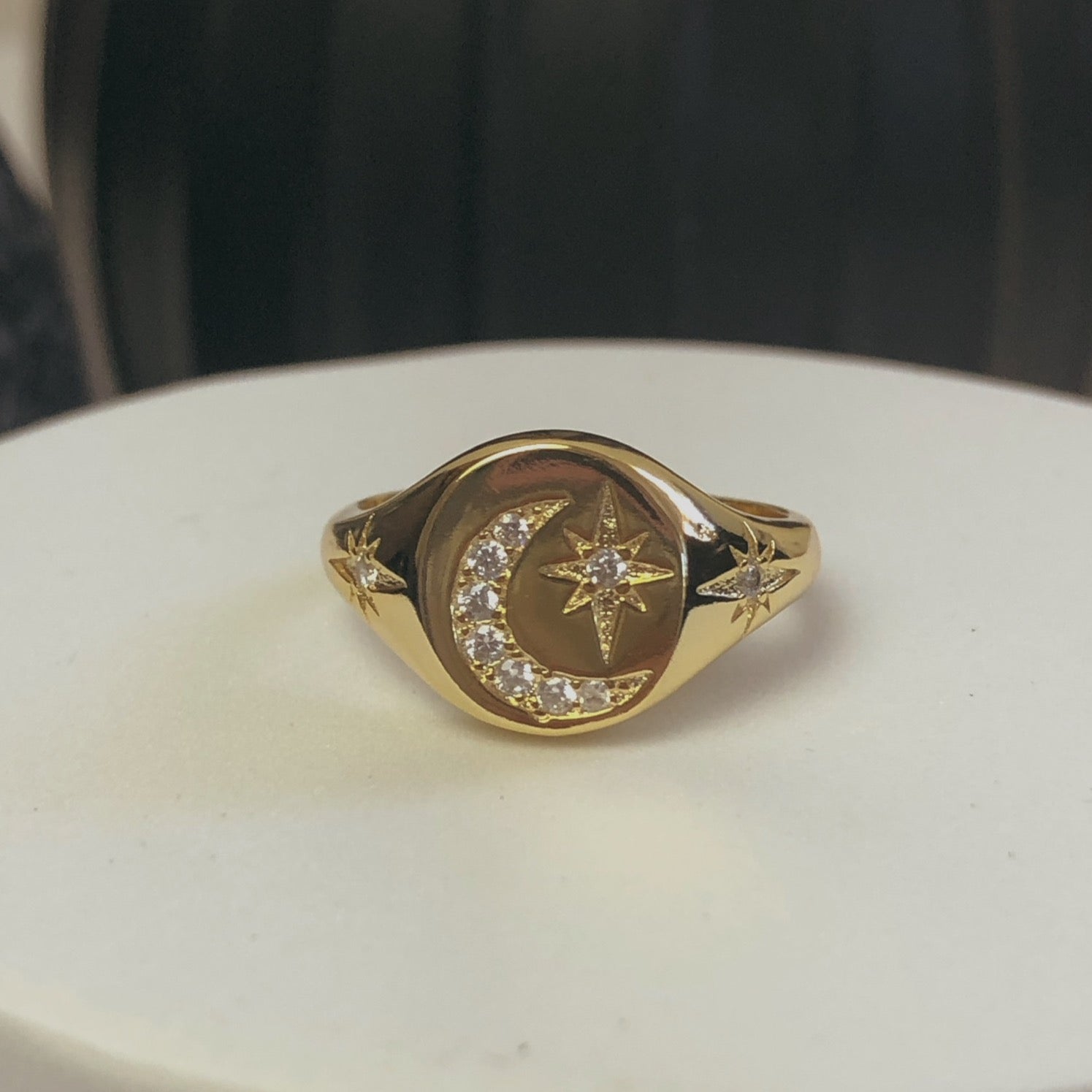 Introducing The Fleur Ring - Crafted with stunning gold and adorned with a twinkling star and moon motif, this stackable showstopper will turn heads. Perfect for making a statement and easily customisable with other rings, the Fleur Ring is guaranteed to take your look to the next level.