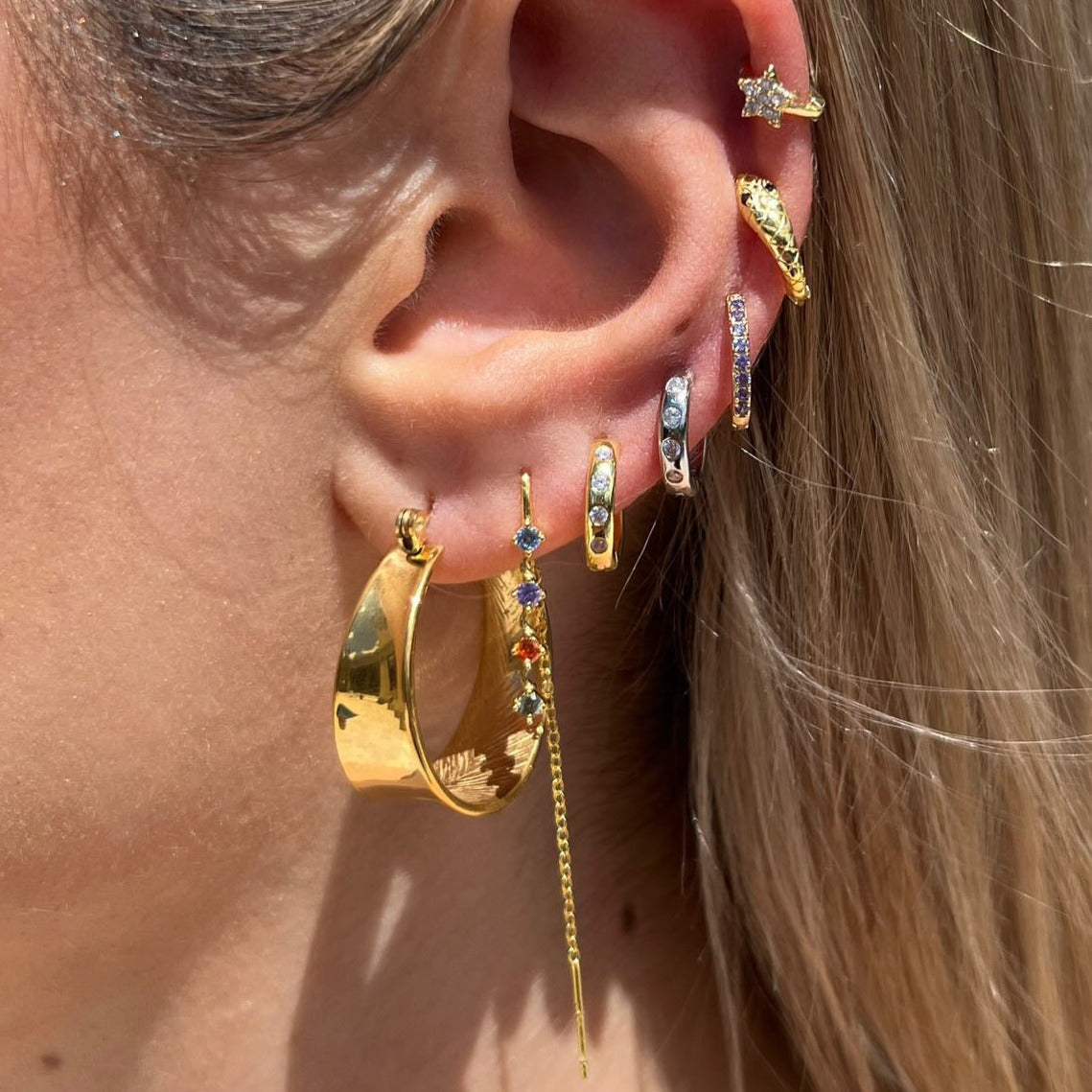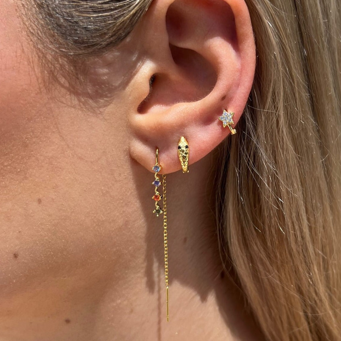 The Milana Earring adds a touch of glamour and extravagance to any look! It's crafted with a gold base, a hanging chain, and colourful rhinestones for extra bling. Let your style sparkle and shine with this elegant earring!