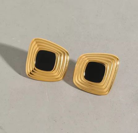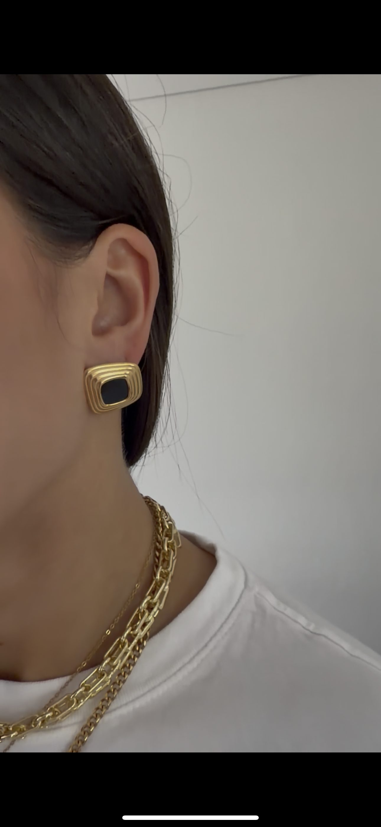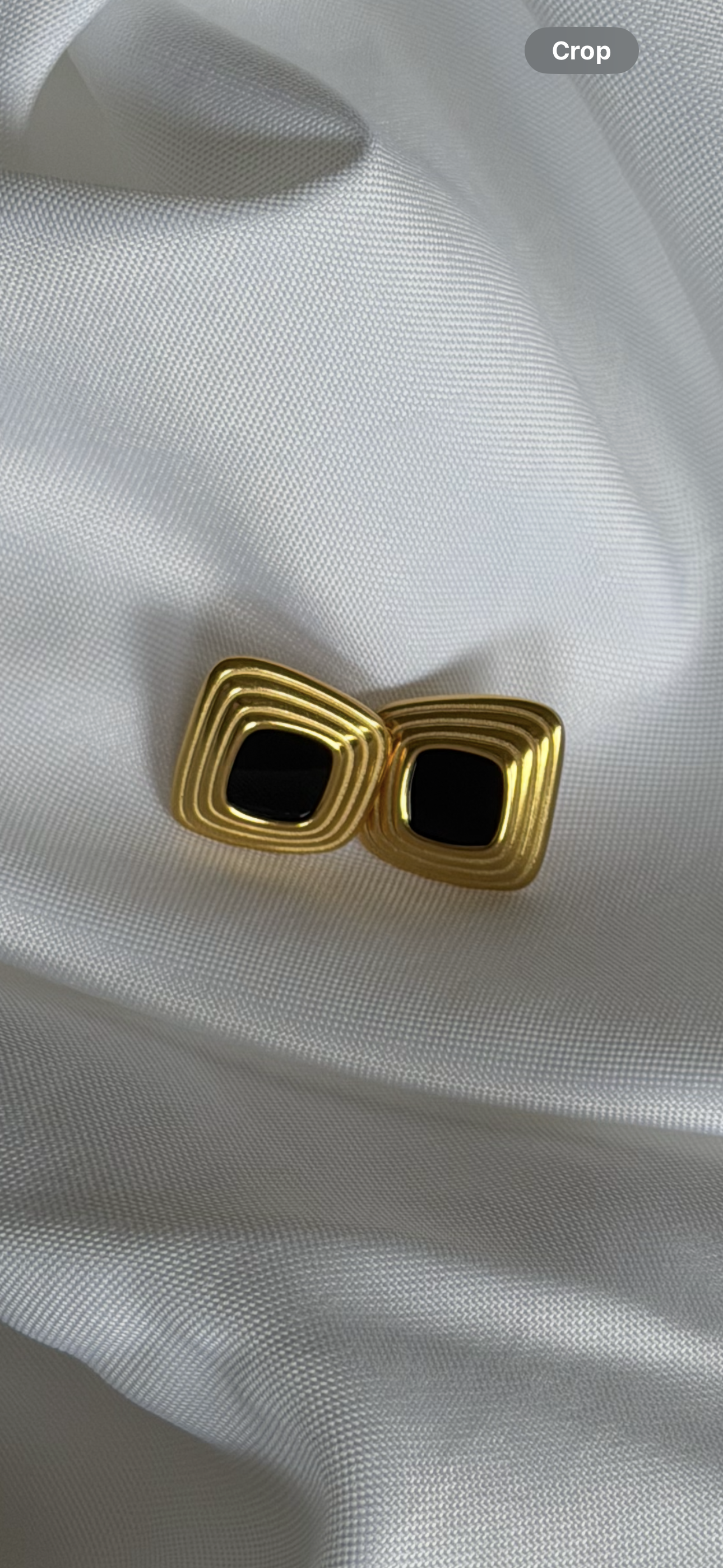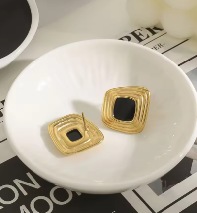 Modern, structured, and effortlessly chic- the Cadence Studs bring instant polish to any look. Featuring a layered gold square design with a glossy black centre, these earrings balance bold geometry with timeless elegance.